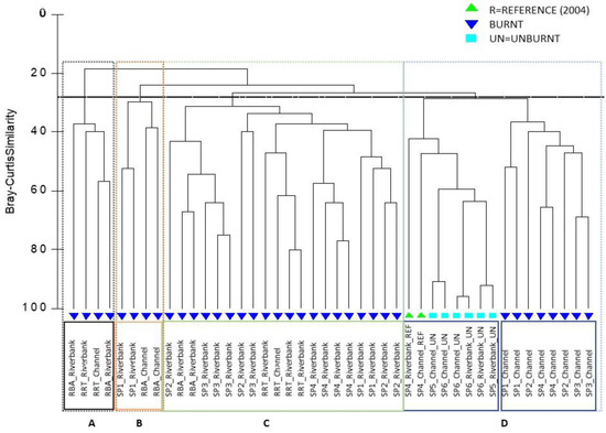 Hierarchical grouping of sites (groups A, B, C, D) from the un-weighted average clustering method using Bray–Curtis similarity coefficient on plant aerial canopy cover of the overall species on riverbanks and channels of the 2018 and 2019 surveys. Ribeira do Brejo D’Água (RBA) and Ribeira do Rio Tinto (RRT) denote the sampling locations on tributaries, and SP1–SP6 are the main river locations on São Pedro River, ordered from the source (SP1) to the river mouth on the Atlantic Ocean (SP6). SP5 and SP6 are unburnt control sites.