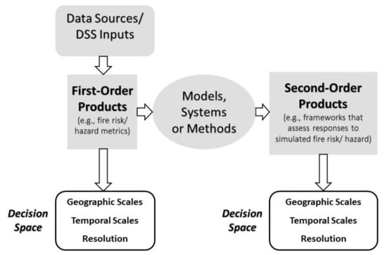 Lastly, many respondents defined DSSs in broad terms. Respondents made distinctions among data, software, and outputs when asked to define DSSs or DSTs. As has been noted, there are many DSSs in use, and those referenced in this paper (Table 4) are not a comprehensive summary (e.g., [,]). Nonetheless, due to the confusion about differences in DSSs expressed by respondents, as well as the other barriers identified by respondents, a clear organization of DSSs in a user-oriented framework that could be coupled with the other recommendations may be warranted. Such a framework could be updated as new tools emerge or existing tools evolve, but it is imperative that it be organized in such a way as to facilitate end-user understanding of the different DSSs and where they can be applied in different decision spaces or decision contexts (e.g., long-term, strategic planning; short-term, tactical planning; and scene-of-action decision-making). A framework for organizing DSSs according to the themes from this research is provided in Figure 1. The framework distinguishes between data or DSS inputs, which are processed to create first-order products such as fire probability surfaces that can provide decision support without any further processing. However, the framework also acknowledges that first-order products can be further processed with different models, systems, or analysis methods to produce second-order products that provide an added level of information for decision making (e.g., QWRA or PODs, see Table 4). Both first- and second-order products can be generated at different geographic and temporal scales, as well as resolutions. Each of these different types of outputs has potential use for decision making, but there is a need to better organize them according to the different decision spaces in which they are relevant.