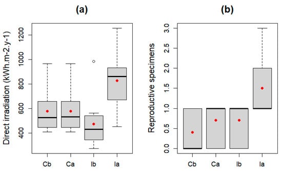 Boxplot of (a) annual direct solar irradiation and (b) total number of reproductive specimens (red point represents the mean value). Cb: control before, Ca: control after, Ib: impact before, Ia: impact after.