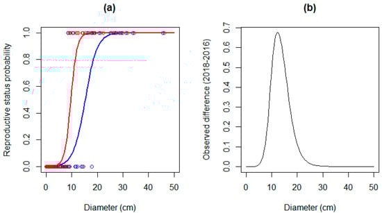 (a) Reproductive status probability in relation to diameter for 2016 (blue) and 2018 (red); (b) observed difference between both reproductive probability curves.