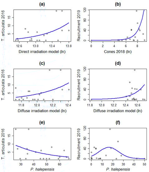 The evolution of the variables in multiple predictor models is particularly interesting. In the 2016 multiple regression model, the number of specimens depends on the reproductive specimens and direct solar irradiation. This behavior is consistent with previous T. articulata research [28] and demographic models of the southeastern Iberian populations [32], where the number of adult specimens is the primary factor driving the recruitment process. The linearity of the radiation and pine canopy cause its correlation to be sufficient for only one of them to be included in the model. The 2019 recruitment model explanation is absorbed by the previous year cone production and the pine cover. Diffuse solar irradiation also appears to play a minor role following the entry of pine canopy in the model. The quadratic behavior of these last two variables suggests them as modulators of the recruitment response against the number of available seed.