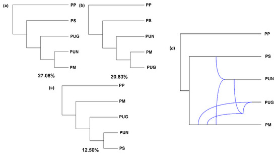 - Than, C.; Ruths, D.; Nakhleh, L. PhyloNet: A software package for analyzing and reconstructing reticulate evolutionary relationships. BMC Bioinform. 2008, 9, 322. [Google Scholar] [CrossRef] [PubMed]