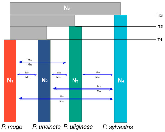 - Wachowiak, W.; Palme, A.E.; Savolainen, O. Speciation history of three closely related pines Pinus mugo (T.), P. uliginosa (N.) and P. sylvestris (L.). Mol. Ecol. 2011, 20, 1729–1743. [Google Scholar] [CrossRef] [PubMed]