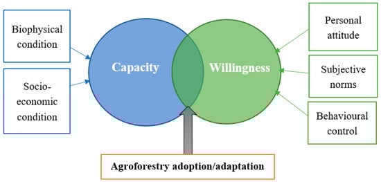 Farmers’ capacity and willingness are two key elements for agroforestry adoption (Figure 1), based on the theory of planned behaviour [31] and the practical evaluation of agroforestry adoption [61]. This study hypothesises that agroforestry adoption will occur when farmers have both the capacity and willingness to adopt agroforestry.