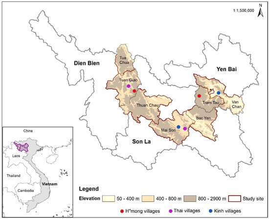 About 3.4 million people live in the northwest provinces of Viet Nam, in culturally diverse communities made up of nearly 30 ethnic groups [23]. In this region, there is a strong link between ethnicity and topography [24], with different ethnic groups associated with different elevations. The main ethnic group occupying lowland areas (below around 600 m) is the Kinh. Although Kinh is the most common ethnic group in Viet Nam, making up 88% of the national population, they are only the second largest group in the northwest, accounting for 26% of the region’s population in 2015 [23]. The Thai group is the third most common ethnic minority of the country (accounting for about 2% of the total population), but the largest group in the northwest (28% of the population in 2015) [23]. Thai people in this region generally live in the middle altitudinal zone (around 600–800 m). The Hmong are the third most common ethnic minority in the northwest (14% of the population in 2015) [23], and generally live at higher altitudes (approximately above 800 m).