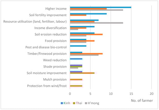 Although farmers from all groups were aware of the benefits of using trees in soil conservation, they had different perceptions on the benefits of specific agroforestry practices, which was likely to influence the types of agroforestry adopted (see Figure 3). All groups stated that agroforestry practices had some provisioning function relating to income generation but had differing needs in relation to regulating functions. The H’mong group were interested in increased land, labour and fertiliser use efficiency, while the Thai highlighted soil erosion reduction, and the Kinh were motivated by the idea of soil fertility improvement. This study suggests that farmers’ specific social circumstances influence their aspirations and constraints related to adopting agroforestry interventions. When it comes to tree planning, H’mong farmers have myriad considerations even with increased demand for fuelwood and timber for house construction—first is to save time walking from and to their farms and homes; second is their limited family labour; and third is the high-cost of fertilisers. Meanwhile, Thai farmers think that timber and firewood, food for humans and animals (buffalo and cow), and soil erosion mitigation are important benefits that can be derived from agroforestry. Most Thai households have confined animals, so fodder grasses in agroforestry practices are useful to augment their cut-and-carry animal feeding strategies. However, reluctance to adopt agroforestry also grew from concerns that trees grow slowly, affecting cash flow. Finally, apart from income, Kinh farmers think that agroforestry is an efficient strategy to address having a limited size of land holding. Having more access to technical information from local extension workers, the Kinh are more willing to intercrop various tree species, especially in home-gardens. In Tan Que district, Son La province, many Kinh farmers are already intercropping peanuts and beans with perennials to improve soil fertility and optimise land productivity.