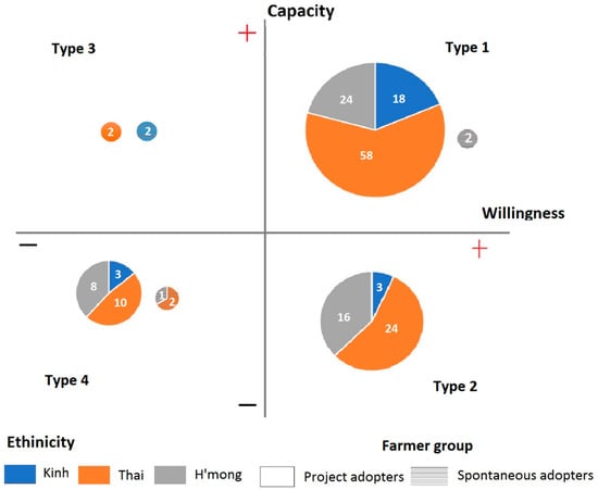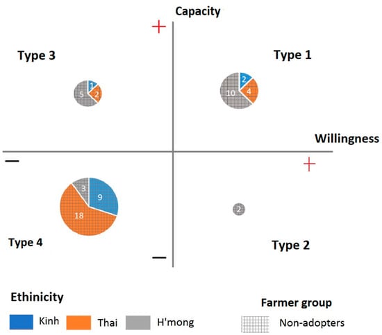 We examined the capacity and willingness of non-adopters, wherein more than half (53%), and mostly Thai and Kinh were Type 4 farmers who were unwilling to adopt or expand agroforestry due to limited capacity in land, labour, financing and technical management (Figure 4), and also because of a lack of evidence on agroforestry benefits. Type 3, comprising 14% of non-adopters, mostly belonged to the H’mong ethnic group who expressed a lack of know-how on agroforestry.