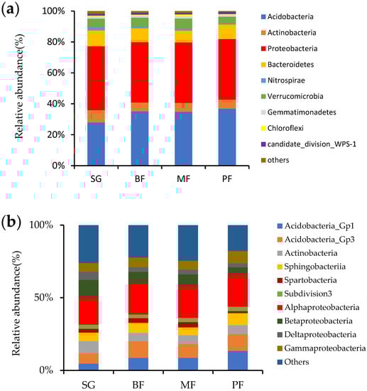 In all of the samples, Proteobacteria was the most abundant phylum, accounting for 38.0–42.1% of the total sequences. Acidobacteria was the second most dominant phylum with a relative abundance of 26.4–36.7%. Bacteroidetes, Actinobacteria, and Verrucomicrobia accounted for 7.7–10.29%, 5.3–8.22%, and 4.85–7.12%, respectively. Nitrospirae, Gemmatimonadetes, Chloroflexi, and Candidate_division_WPS-1 were also identified at relatively low abundances (mean relative abundance <3%) (Figure 1a, Table S2). Acidobacteria and Actinobacteria in the SG stage were significantly different from those in the other stages. In the BF stage, the dominant phyla (Acidobacteria and Actinobacteria) in the secondary forest returned to a similar level to that of the intact PF. Chloroflexi in the MF stage significantly differed from the others and Bacteroidetes and Verrucomicrobia were significantly different between the MF and PF stages. In the MF stage, these similar level phyla (Chloroflexi, Bacteroidetes, and Verrucomicrobia) deviated from that of the original forest. The abundance of Nitrospirae significantly decreased in the rehabilitation stage. Alphaproteobacteria, Betaproteobacteria, and Acidobacteria_Gp3 were the most abundant classes in all of the rehabilitation stages (Figure 1b, Table S3) and Rhizobiales, Sphingobacteriales, and Rhodobacterales were the most abundant orders (Figure 1c, Table S4). The relative abundances of Acidobacteria_Gp3, Acidobacteria_Gp1, and Rhodobacterales during the PF stage were significantly higher than those in the other stages. The relative abundances of Betaproteobacteria, Nitrospirales, and Gaiellales were the highest during the SG stages. There was no significant difference in Alphaproteobacteria and Rhizobiales abundance in the different stages. These results show that the bacterial community structures will gradually recover with the succession of restoration, but the recovery direction of the bacteria differs, especially in the true broad-leaved mixed forest stage.