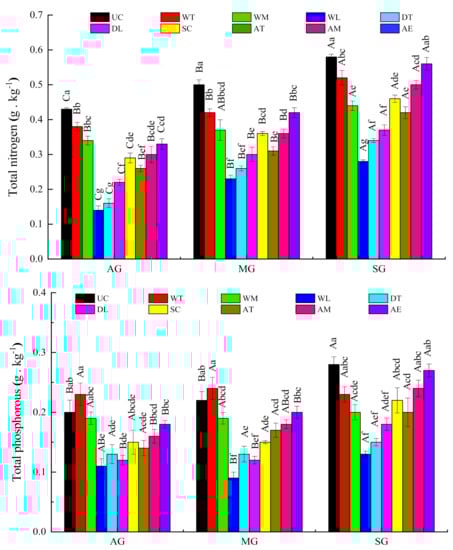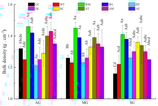 Bulk density in the different spatial position in different stages of Benggang restoration. AG: active stage of Benggang; MG: semi-stable stage of Benggang; SG: stable stage of Benggang. UC: upper catchment; WT, WM, WL: the top, middle and lower of collapsing wall; DT, DL: the top and lower of colluvial deposit; SC: scour channel; AT, AM, AE: the top, middle and edge of alluvial fan. Different capital letters mean significant differences between different development stages of Benggang in the same position, different small letters mean significant differences between different positions of Benggang at the same development stage at 0.05 level. The same as below.