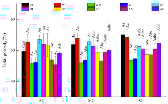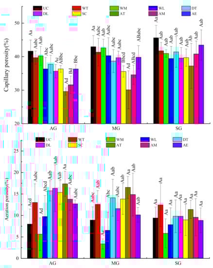 Soil porosity affects soil aeration, water permeability and tree root growth and is an important index of soil fertility. Soil porosity and bulk density showed an opposite trend of change, that is, the bulk density decreased and the porosity increased. The soil total porosity and capillary porosity increased with enhancing Benggang restoration, whereas the aeration porosity content decreased. Overall, the spatial distribution of soil pores (total porosity, capillary porosity and aeration porosity) was not significantly different among the different stages of Benggang restoration (Figure 4).