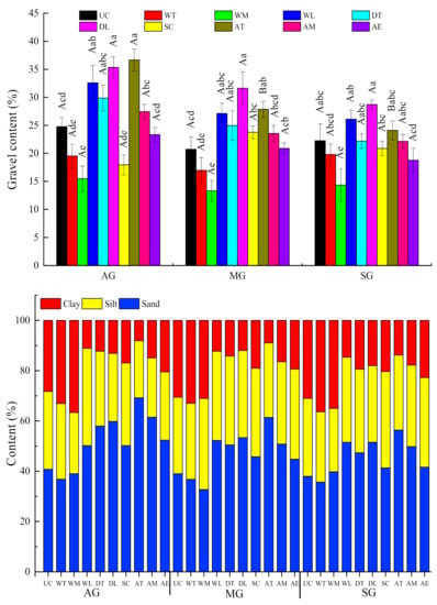 The content of gravel, sand, clay and silt in the different spatial positions in different stages of Benggang restoration.