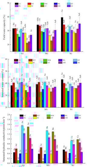 The saturated hydraulic conductivity content gradually decreased with Benggang restoration, whereas the field water capacity content showed the opposite trend. The saturated hydraulic conductivity, field water capacity and saturated water content had the same trend in the of runoff direction in the different stages of Benggang restoration (Figure 6).