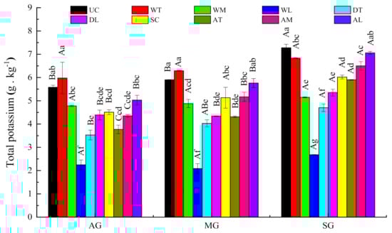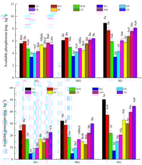 Soil particle sizes were described in terms of the percentages of sand (0.05~2 mm), silt (0.002~0.05 mm) and clay (<0.002 mm) according to the United States Department of Agriculture classification of soil particle size and determined by the pipette and sieve method. The ring cutting method was used for soil bulk density, total porosity, capillary porosity, aeration porosity, and saturated water content determination. A pH meter was used to measure the pH of a 1:2.5 soil: water suspension. Soil organic matter (OM) was obtained by the K2Cr2O7-H2SO4 oxidation method. The semi-micro Kjeldahl method was used for determining the content of total nitrogen (TN). Total phosphorous (TP) was determined colorimetrically after wet digestion with H2SO4-HClO4 []. Flame photometry was used to measure the content of total potassium (TK). The alkaline permanganate oxidation method was determined available nitrogen (AN) []. The Olsen’s method was used for colorimetric determination of the content of available phosphorus (AP) in 0.5 mol NaHCO3 (pH 8.5) []. The content of available potassium (AK) was assayed using flame atomic absorption spectrophotometry []. Cation exchange capacity (CEC) was determined by ammonium acetate extraction buffered at pH 7 [].