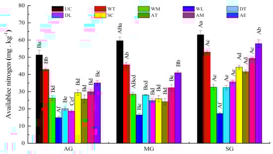 Soil available nutrients which are the direct sources of the three elements necessary for biological growth and are influenced by natural factors, such as terrain and climate and by human factors during the formation process and have characteristically high spatial heterogeneity [,]. The available nutrient contents in the active stage of Benggang restoration were generally lower than those in the semi-stable and stable stages of Benggang restoration, in which the contents of available nitrogen and available phosphorus varied significantly. These differences were mainly caused by the decomposition of natural minerals and soil organic matter during the ecological restoration process []. The high spatial differentiation was that the nutrients in the gully region were carried away by rainwater runoff under the action of hydraulic erosion and gravity and where soil nutrients had not accumulated. Meanwhile, soil leaching accelerates the decomposition rate of available nutrients. The content of available nitrogen in the Benggang areas was significantly correlated with the total porosity, capillary porosity, clay, soil organic matter, and total nutrients, which may be related to the source of the total nutrients. The available potassium content has significantly positive or negative correlations with capillary porosity, soil particle characteristics, soil organic matter, and total nutrients, which may be related to the effects of granite weathering on the soil.