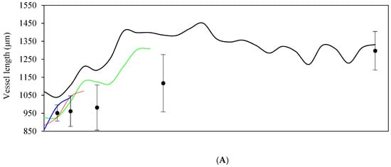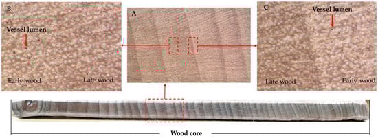 The observation of the annual ring width (RW) and latewood percentage (LP) was made under a microscope (Zeiss Imager. A2, Germany) (Figure 1). Every 2 annual rings of the wood strips were divided into 1 pith-to-bark oriented sample. Wood air-dry density (WADD) was measured by a soft X-ray microdensitometer (type 2405). The wood basic density (WBD) was measured by the maximum moisture content method (wet weight and dry weight of the samples were measured, respectively) []. The fiber and vessel morphology were determined using the mixture segregation of 30% hydrogen peroxide and glacial acetic acid (1:1) at 90 °C for 4 h. The macerated tissue was washed in running water until the tissue was free of all acid traces, so that the lengths of the fiber and vessel elements could be determined. The macerated tissue was then crushed in water to make a temporary section by safranine (1%) staining, and 50 intact fibers and vessels were randomly measured, respectively, under a biological projection microscope (Zeiss Imager. A2, Germany). Software ImageJ (v1.52) was used to analyze all images.