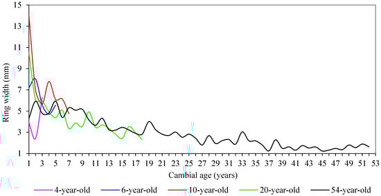 Overall, the annual ring width rapidly decreased from the pith and slightly decreased close to the bark (Figure 2). This reflected that S. superba grew faster and had a larger diameter increment in the early stage. The wood density decreased rapidly in the first 20 years with subsequent stabilization (Figure 3A,B). In the first 20 years, the mean wood air-dry density and basic density were 0.75 g·cm−3 and 0.56 g·cm−3, respectively. After 20 years, they decreased to a mean of 0.70 g·cm−3 and 0.52 g·cm−3, respectively.