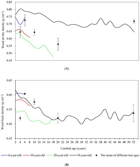 The radial variation in both wood air-dry density (A) and wood basic density (B) versus cambial age and the mean of different tree ages in S. superba.