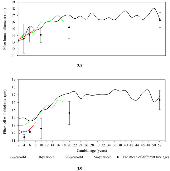 The radial variation in fiber characters versus cambial age and the mean of different tree ages in S. superba, including fiber length (A), fiber width (B), fiber lumen diameter (C) and fiber cell wall thickness (D).