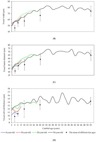 The radial variation in vessel characters versus cambial age and the mean of differently aged S. superba, including vessel length (A), vessel width (B), vessel lumen diameter (C) and vessel cell wall thickness (D).