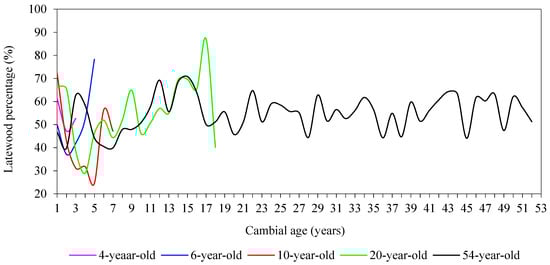 The radial variation of annual latewood percentage versus cambial age in S. superba.