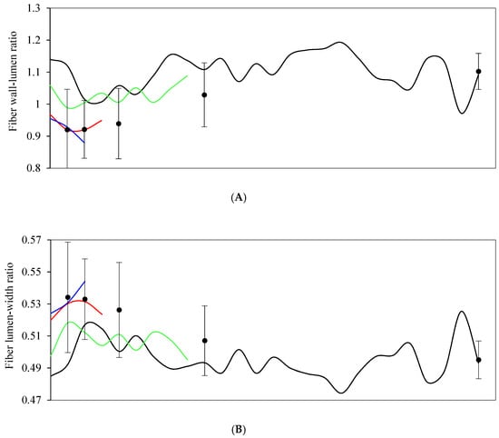The radial variation patterns of the fiber and vessel width, fiber lumen diameter and fiber cell wall thickness were slightly different from those of the fiber and vessel length. They increased rapidly with cambial age from the pith and remained stable with minor fluctuation. The fiber width varied between 27.11 and 34.28 μm, with growth increasing to 26.45% in the first 20 years and varying around a mean value of 33.87 μm in the later stage (Figure 4B). The value of vessel width increased from 58.72 to 87.66 μm gradually from the 2nd year to 24th year, with growth increasing to 49.28% and then approached an asymptotic value (83.68 μm) after the 24th year (Figure 5B). The fiber lumen diameter increased to 29.18%, and its variation was 8.29% from the 2nd year to the 20th year and then remained at a stable value (16.85 μm), with variation decreasing to 3.05% (Figure 4C). The fiber cell wall thickness reached the maximum (17.42 μm) in the 22nd year, with growth increasing to 25.26% and then fluctuated above and below 16.99 μm after the 22nd year (Figure 4D).