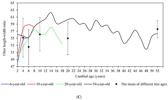 The radial variation in fiber wall-lumen ratio (A), fiber lumen-width ratio (B) and fiber length-width ratio (C) versus cambial age and the mean of differently aged S. superba.