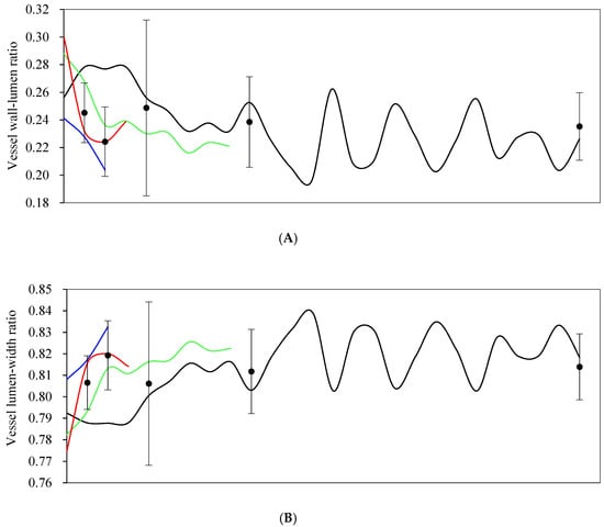 Vessel lumen diameter and vessel cell wall thickness increased from the pith and approached an asymptotic value near the outer wood, but there was a larger fluctuation in the later stage. The vessel lumen diameter reached the maximum (73.13 μm) in the 24th year, with growth increasing to 56.58%, and the variation was 14.47%. It then fluctuated above and below 69.05 μm after the 24th year, and the variation decreased to 3.98% (Figure 5C). The vessel cell wall thickness increased from 11.63 to 15.75 μm, with growth increasing to 35.48%, from the 2nd year to the 20th year, and the variation was 8.27%. It remained at a stable value of 14.65 μm, with variation decreasing to 5.95% (Figure 5D).