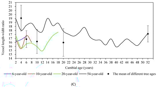 The radial variation of vessel wall-lumen ratio (A), vessel lumen-width ratio (B) and vessel length-width ratio (C) versus cambial age and the mean of differently aged S. superba.