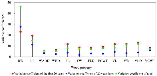 The variation coefficient of wood properties of S. superba in the first 20 years, 20 years later and in all years. RW: ring width, LP: latewood percentage, WADD: wood air-dry density, WBD: wood basic density, FL: fiber length, FW: fiber width, FLD: fiber lumen diameter, FCWT: fiber cell wall thickness, VL: vessel length, VW: vessel width, VLD: vessel lumen diameter, VCWT: vessel cell wall thickness.