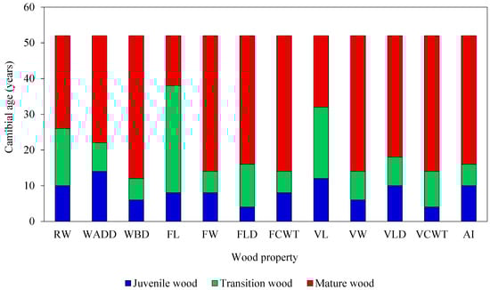 Wood is formed from the cambium, and juvenile wood is formed when the cambium age is younger. At a certain age, it gradually transits to the mature stage to form mature wood. Juvenile wood has large variations and poor wood properties, and it is restricted in certain aspects of wood utilization, while mature wood has stable wood properties and good quality and is widely used []. The change in wood properties between juvenile wood and mature wood is not obvious in some tree species, and it is a gradual process during tree growth. However, through the radial variation pattern of wood properties, the boundary of juvenile and mature wood could be determined with a statistics model. Mvolo et al. [] used the linear mixed model, maximum-quadratic-linear model and piecewise model to estimate transition age in Picea glauca based on tracheid length radial variation and found that transition age ranged from the 11th to the 27th year and juvenile wood proportion ranged from 15.3% to 47.5%. Palermo et al. [] studied the juvenile, transition and mature wood zones of 23-year-old Eucalyptus grandis by fiber length measurement from the pith to the bark and found that the transition zone occurs between the 8th and the 13th year. In a word, determining the boundary between juvenile wood and mature wood accurately is conducive to the efficient utilization of wood.