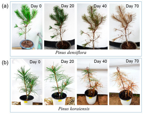 Time-lapsed changes of Pinus densiflora and P. koraiensis after infection of pine wood nematode (PWN): (a) P. densiflora 0, 20, 40, and 70 days after PWN infection, and (b) P. koraiensis 0, 20, 40, and 70 days after PWN infection.