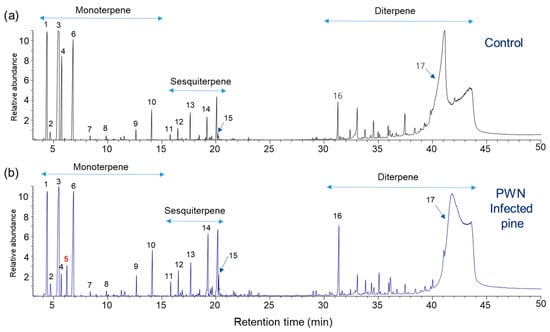 GC-MS analysis of terpenoids in resin obtained from pine wood nematode (PWN)-infected and non-infected Pinus densiflora plants: (a) Resin compounds of control P. densiflora, and (b) resin compounds of PWN-infected P. densiflora. 1. α-pinene, 2. camphene, 3. β-pinene, 4. β-myrcene, 5. 3-carene, 6. β-phellandrene, 7. terpinolene, 8. L-pinocarveol, 9. methylthymylether, 10. acetic acid, 11. α-cubebene, 12. copaene, 13. β-caryophyllene, 14. β-cubebene, 15. δ-cadinene, 16. isocembrol, 17. resin acids.