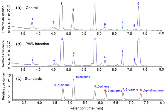 HS-SPME/GC-MS analysis of volatile organic compounds in pine wood nematode (PWN)-infected and non-infected Pinus densiflora plants: (a) Monoterpenes in total ion chromatograms (TIC) of non-infected P. densiflora, (b) monoterpenes in TIC chromatograms of P. densiflora after PWN infection, and (c) chromatograms of monoterpenes authentic standards. 1. oxime-methoxy-phenyl, 2. tricyclene 3. α-pinene, 4. camphene, 5 β-pinene, 6. β-myrcene, 7. 3-carene, 8. p-cymol, 9. β-phellandrene.