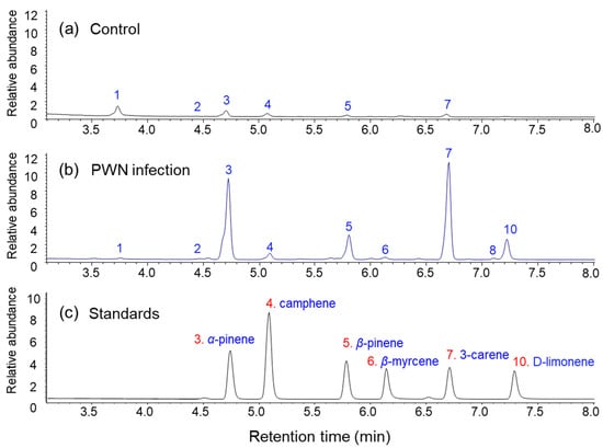 HS-SPME/GC-MS analysis of volatile organic compounds in pine wood nematode (PWN)-infected and non-infected Pinus koraiensis plants: (a) GC chromatograms of volatile monoterpenes in control P. koraiensis, (b) GC chromatograms of volatile monoterpenes in P. koraiensis after PWN infection, and (c) chromatograms of volatile monoterpenes authentic standards. 1. oxime-methoxy-phenyl, 2. tricyclene 3. α-pinene, 4. camphene, 5 β-pinene, 6. β-myrcene, 7. 3-carene, 8. p-cymol, 10. D-limonene.