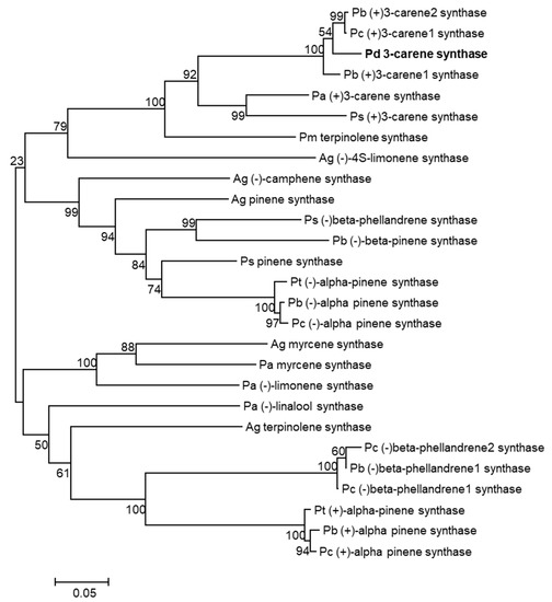 Phylogenetic analysis was performed with the MEGA v6.06 software program. The deduced amino acid sequences of monoterpene synthase from other conifer species were obtained from DDBJ/GenBank/EMBL. Multiple sequence alignments were generated using the CLUSTAL W program. The maximum likelihood (ML) method was applied to estimate the strength of nodes with a bootstrap of 1000 replications in the tree [26,27].