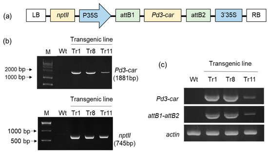 Construction of transgenic tobacco plants overexpressing Pd3-car gene and RT-PCR analysis: (a) Schematic diagram of the Pd3-car gene overexpression vector plasmid under the control of the Cauliflower mosaic virus (CaMV) 35S promoter. LB represents the left border and RB represents the right border of the T-DNA. NPT, kanamycin resistance gene; P35S, CaMV 35S promoter; 3′35S, CaMV 35S terminator. (b) Genomic PCR of wild-type and transgenic lines overexpressing the Pd3-car gene. PCR products of genomic DNA extracted from the wild-type tobacco and three transgenic lines followed by screening with Pd3-car and nptII gene primers. (c) Expression of the introduced Pd3-car gene and attB1-attB2 vector region by RT-PCR. β-actin was used as a loading control. M = marker (1 kb), Wt = wild type, Tr = selected transgenic tobacco lines.