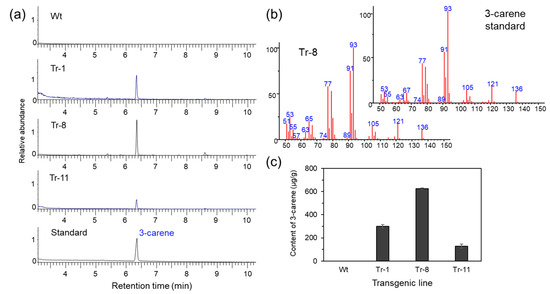 The leaf volatile compounds of transgenic and non-transgenic plants were analyzed using SPME/GC-MS. Total ion chromatogram (TIC) indicated a new peak at a retention time of 6.48 min in transgenic plants (Figure 7a), but not in the wild-type tobacco. The retention time of the peak and its MS fragmentation pattern precisely matched those of the 3-carene standard (Figure 7b). The content of 3-carene was the largest at Tr8 (626.56 μg/g), which was consistent with the expression pattern of 3-carene synthase (Figure 7c).
