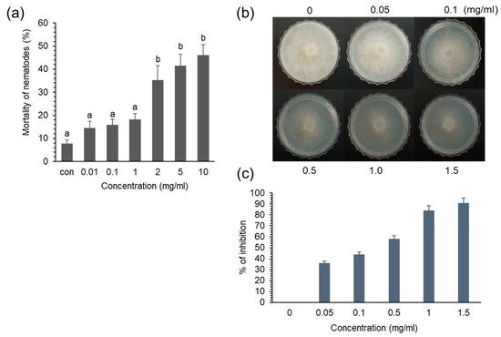 To measure nematicidal and antifungal activities of 3-carene, test solutions containing various concentrations of 3-carene were treated to PWNs for two days. No significant difference was found in PWNs with treatment from 0.01 to 1 mg/mL 3-carene concentration, but 35.25% of PWNs were immobilized at a 2 mg/mL concentration of 3-carene, and 45.98% of PWNs were immobilized at a 10 mg/mL concentration of 3-carene (Figure 8a).