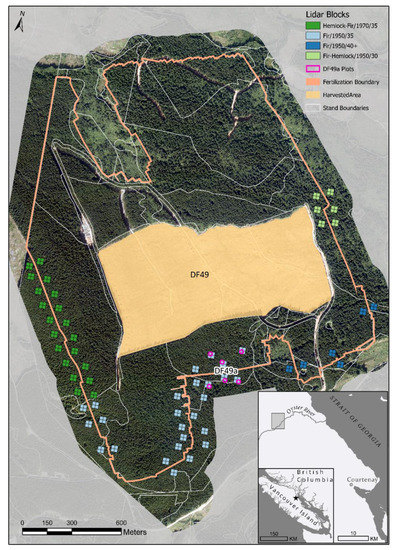 Study area map showing the fertilization area (orange lines); DF49a fertilized and control sample plots (pink); and LiDAR blocks for forest stand analysis units of Hemlock-Fir (dark green), Fir (Site Index 30) (light blue); Fir (Sight Index 40+) (dark blue); and Fir-Hemlock (light green). The main stand, DF49, was the location of flux towers and plots established in 2002 and measured until 2011, when the stand was cut. White lines show the 2010 forest stand polygon boundaries.