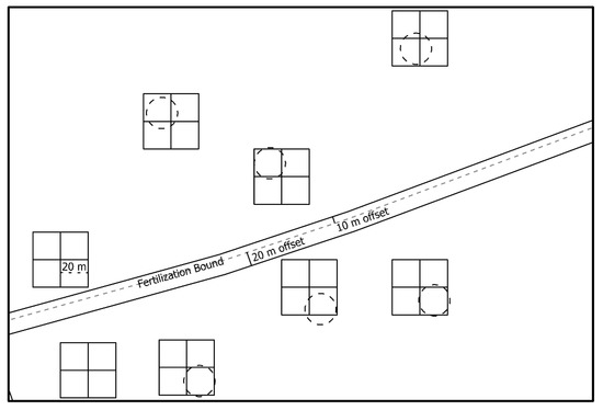 LiDAR paired block design in the DF49a area showing the fertilization boundary, buffered offsets, and sample plots’ location within cells (dashed circles).