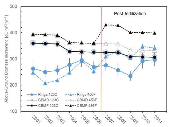 Annual above-ground biomass carbon increments from the CBM-CFS3 model for control (123C solid line, circles) and fertilized (456F, dashed line triangle) plots using yield curves derived from plot tree-ring data (Rings), default stand type yield curves without a fertilizer effect (CBMD gray lines, open symbols), or default yield curves with a fertilizer effect (CBMF black line, closed symbols). Rings data show plot mean with one standard error.