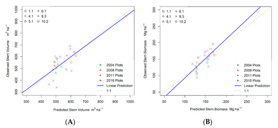 Observed plot level vs. RF predicted volume (A) and biomass (B) values in 2004 (green), 2008 (orange), 2011 (purple), and 2016 (pink).