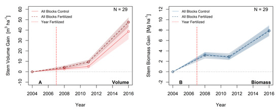 LiDAR block-level average (line) and standard error (shadow) of stem volume (A) and biomass (B) cumulative increments (gain) for control blocks (solid) and fertilized blocks (dashed).