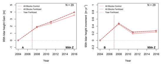 LiDAR block-level average (line) and standard error (shadow) of 95th percentile of LiDAR heights (A) and height periodic annual increments (B) for control blocks (solid) and fertilized blocks (dashed).