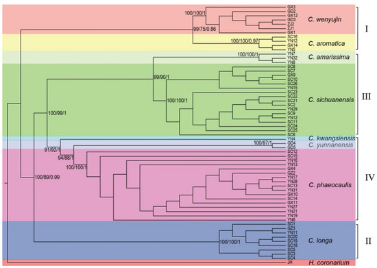 The ML, MP, and BI trees of Chinese Curcuma. The values (maximum likelihood bootstrap/maximum parsimony bootstrap/Bayesian support value) were on the species clade. The Group I consisted of C. wenyujin and C. aromatica; Group II consisted of C. longa; The Group III consisted of C. amrissima and C. sichuanensis; The Group IV consisted of C. kwangsiensis, C. yunnanensis, and C. phaeocaulis.