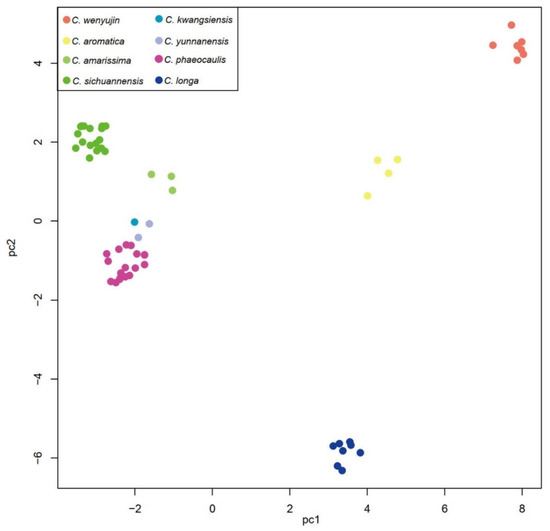 The principle components analysis of Chinese Curcuma. Principal component analysis (PCA) of the 60 individuals and different species with different colors.
