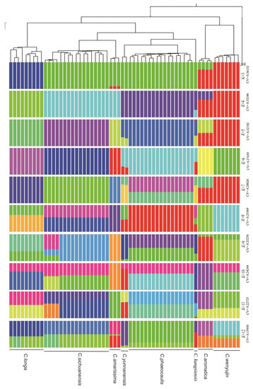 To test the evolution of Chinese Curcuma, a Bayesian clustering algorithm with admixed models was used to estimate the ancestral proportions (K) for each specimen (Figure 3). Based on CV error, the K = 12 represented the best model for these 60 samples. When K = 3, the eight species belong to three gene pools (blue gene pools, green gene pools, and red gene pools). C. longa had independent gene pools (blue). The species of C. amarissima, C. sichuanensis, C. kwangsiensis, C. yunnanensis, and C. phaeocaulis shared green gene pools. The red gene pools were shared by C. wenyujin and C. aromatica; When K = 4 to 12, C. longa could be distinguished by constitution of gene pool, and Group I (C. wenyujin and C. aromatica) is close to Group IV (C. kwangsiensis, C. yunnanensis, and C. phaeocaulis).