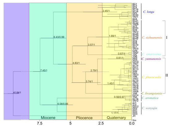 Phylogeny tree resulting from the Bayesian inference and divergency time of Chinese Curcuma in BEAST (Divergence time/Bayesian support). Group I consisted of C. amarissima, C. sichuanensis, C. kwangsiensis, C. yunnanensis, and C. phaeocaulis. Group II was made up of C. kwangsiensis, C. yunnanensis, and C. phaeocaulis.