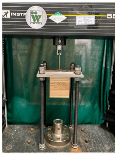 According to EN 1382 [30], the withdrawal tests were performed under push–pull load conditions on the universal testing machine (Instron 5582) with a constant loading rate of 2 mm/min, as shown in Figure 1. The withdrawal strength was determined following Equation (2)