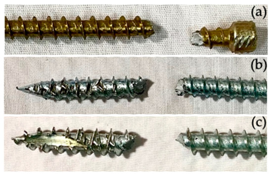 To classify the axial tensile performance of the three types of STS, the tensile resistance and strength were determined. Figure 2 shows the typical failure modes. The screws fractured at an arbitrary position along the threaded part, e.g., near the head side (Figure 2a), sharp-cut tip side (Figure 2c), or the middle part (Figure 2b). Differences in failure mode between the three types of screws were not observed [28].